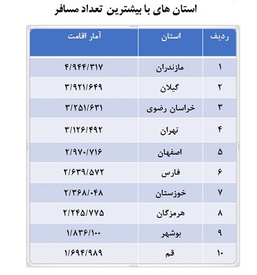 به گفته دبیر ستاد مرکزی هماهنگی خدمات سفر، در استانهای خراسان رضوی، مازندران، گیلان، فارس، هرمزگان، اصفهان، یزد، خوزستان، کرمان و اردبیل، بیشترین اقامت نوروزی ثبت شده است.