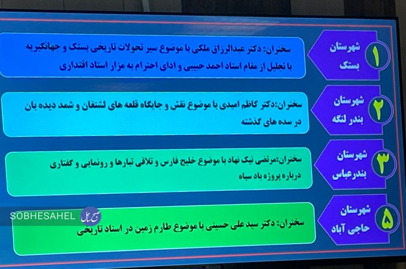 جشنواره امسال با آغاز برنامههای علمی از شهرستان بستک و تجلیل از استاد احمد حبیبی کلید میخورد. سپس نشستهای علمی و پژوهشی در شهرستانهایی همچون بندر لنگه، بندرعباس، حاجیآباد، جاسک و جزیره هرمز ادامه خواهد یافت. این نشستها، موضوعاتی همچون تاریخ تحولات منطقه، نقش قلعههای بندر لنگه در تجارت، و اسناد تاریخی خلیج فارس را در بر میگیرند.