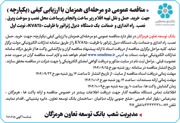 بانک توسعه تعاون هرمزگان در نظر دارد مناقصه عمومی دو مرحلهای همزمان با ارزیابی کیفی (یکپارچه) جهت خرید، حمل، نصب، راه اندازی و ضمانت یک دستگاه دیزل ژنراتور با ظرفیت KVA250 را از طریق سامانه تدارکات الکترونیکی دولت برگزار نماید. کلیه مراحل برگزاری مناقصه از دریافت اسناد تا ارائه پیشنهاد مناقصه گران و بازگشایی پاکت ها از طریق درگاه سامانه تدارکات الکترونیکی دولت (ستاد) به آدرس www.setadiran.ir انجام خواهد شد و لازم است مناقصه گران در صورت عدم عضویت قبلی ، مراحل ثبت نام در سایت مذکور و دریافت گواهی امضای الکترونیکی را جهت شرکت در مناقصه محقق سازند .