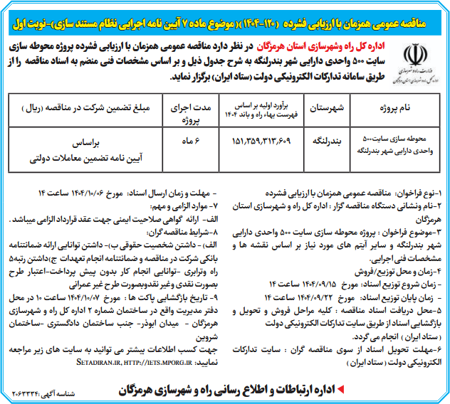 اداره کل راه وشهرسازی استان هرمزگان در نظر دارد مناقصه عمومی همزمان با ارزیابی فشرده پروژه محوطه سازی سایت 500 واحدی دارایی شهر بندرلنگه به شرح جدول ذیل و بر اساس مشخصات فنی منضم به اسناد مناقصه را از طریق سامانه تدارکات الکترونیکی دولت (ستاد ایران) برگزار نماید.
