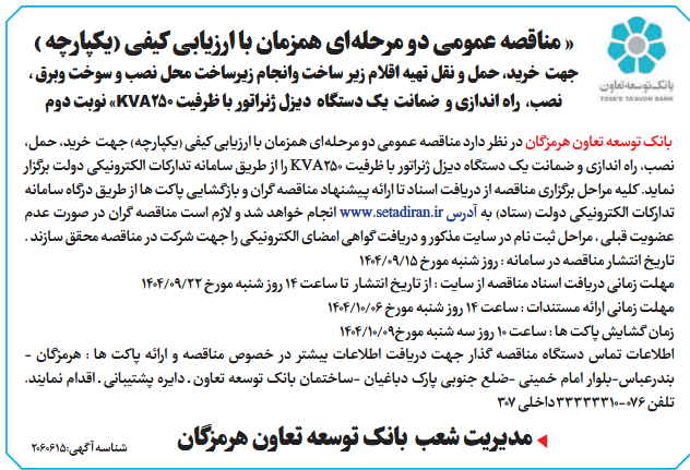 بانک توسعه تعاون هرمزگان در نظر دارد مناقصه عمومی دو مرحلهای همزمان با ارزیابی کیفی (یکپارچه) جهت خرید، حمل، نصب، راه اندازی و ضمانت یک دستگاه دیزل ژنراتور با ظرفیت KVA250 را از طریق سامانه تدارکات الکترونیکی دولت برگزار نماید. کلیه مراحل برگزاری مناقصه از دریافت اسناد تا ارائه پیشنهاد مناقصه گران و بازگشایی پاکت ها از طریق درگاه سامانه تدارکات الکترونیکی دولت (ستاد) به آدرس www.setadiran.ir انجام خواهد شد و لازم است مناقصه گران در صورت عدم عضویت قبلی ، مراحل ثبت نام در سایت مذکور و دریافت گواهی امضای الکترونیکی را جهت شرکت در مناقصه محقق سازند .