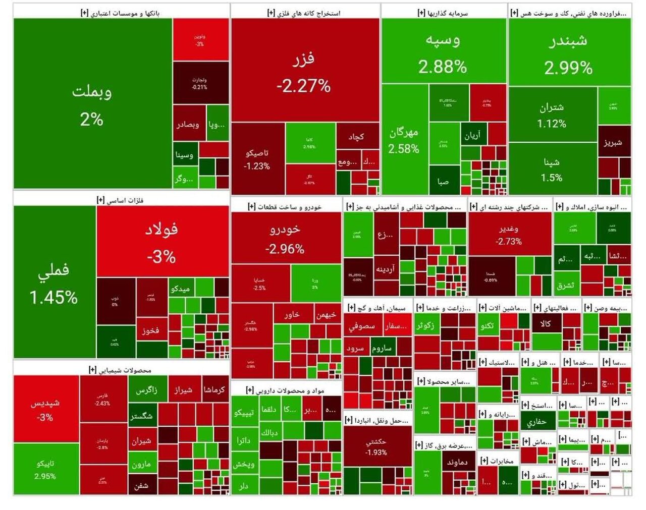 در معاملات امروز، ۳۲ درصد نمادها (۲۸۴ نماد) مثبت و ۶۸ درصد نمادها (۶۰۵ نماد) منفی بسته شدند که نشاندهنده فضای افزایشی محدود و مثبت بودن کلی بازار با غالبیت فشار فروش است. سرانه خرید حقیقی ۶۲ میلیون تومان و سرانه فروش حقیقی ۷۰.۴ میلیون تومان بود. ارزش سفارشات خرید در بازار به ۲,۰۶۶ میلیارد تومان و ارزش سفارشات فروش به ۸۸۲ میلیارد تومان رسید که تمایل به فروش در بازار بالاتر از خرید ثبت شد.
