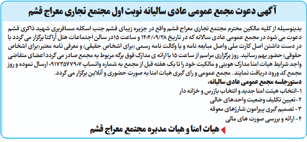 بدینوسیله از کلیه مالکین محترم مجتمع تجاری معراج قشم واقع در جزیره زیبای قشم جنب اسکله مسافربری شهید ذاکری قشم دعوت می شود در مجمع عمومی عادی سالانه که در تاریخ 28/09/1404 و ساعت 15در سالن اجتماعات هتل آراکتا برگزار می گردد با در دست داشتن اصل کارت ملی واصل مبایعه نامه و یا وکالت نامه رسمی (برای اشخاص حقیقی) و معرفی نامه معتبر(برای اشخاص حقوقی) حضور بهم رسانید. روز برگزاری مراسم از ساعت 15 با ارائه ی مدارک فوق برگه مربوط به مجمع صادر می گردد اعضای متقاضی واجد شرایط هیات امنا مدارک هویتی و مالکیت خود را تا یک هفته قبل از مجمع به شماره واتساپ 09173577907 ارسال نموده و روز مجمع کد ورود دریافت نمایند . مجمع عمومی و رای گیری هیات امنا به صورت حضوری و آنلاین برگزار می گردد.
