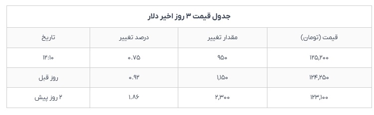 دلار امروز با افزایش ۰.۷۵ درصدی، از ۱۲۴,۲۵۰ (یکصد و بیست و چهار هزار و دویست و پنجاه ) تومان به ۱۲۵,۲۰۰ (یکصد و بیست و پنج هزار و دویست ) تومان رسید