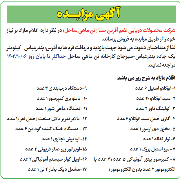 شرکت محصولات دریایی طعم آفرین صبا ( تن ماهی ساحل) در نظر دارد اقلام مازاد بر نیاز خود را از طریق مزایده به فروش برساند. لذا از متقاضیان دعوت می شود جهت بازدید و دریافت فرم ها به آدرس: بندرعباس - کیلومتر یک جاده بندرعباس-سیرجان کارخانه تن ماهی ساحل حداکثر تا پایان روز 06/10/1404 مراجعه نمایند.