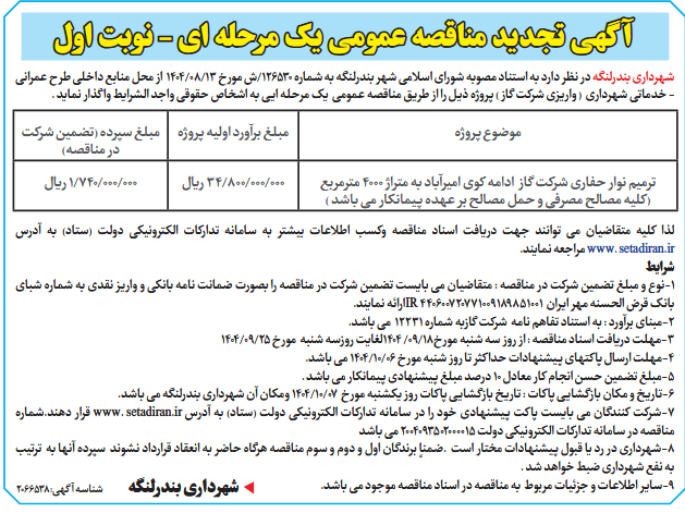 شهرداری بندرلنگه در نظر دارد به استناد مصوبه شورای اسلامی شهر بندرلنگه به شماره 126530/ش مورخ 13/08/1404 از محل منابع داخلی طرح عمرانی - خدماتی شهرداری ( واریزی شرکت گاز ) پروژه ذیل را از طریق مناقصه عمومی یک مرحله ایی به اشخاص حقوقی واجد الشرایط واگذار نماید .