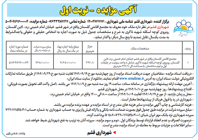 شهرداری قشم در نظر دارد ملک خود معروف به مجتمع اقامتی گلستان واقع در شهر قشم، خیابان امام خمینی (ره) ، لاین گلستان، روبروی کوچه اسکله شهید ذاکری به شرح و مشخصات جدول ذیل به صورت اجاره به اشخاص حقیقی و حقوقی واجدالشرایط