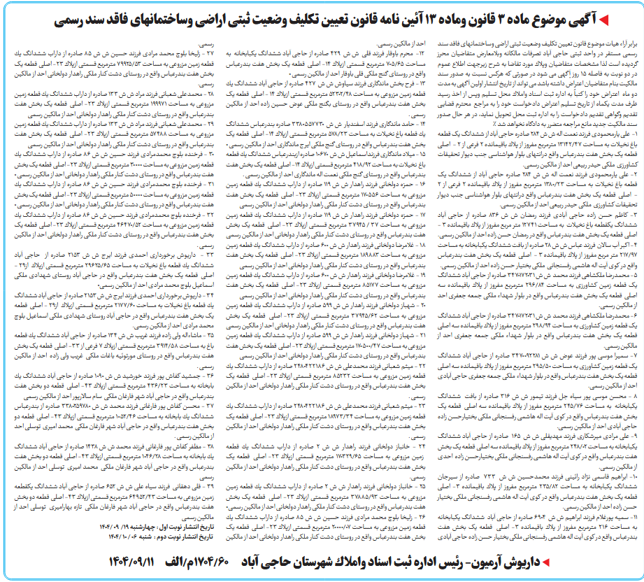 برابر آراء هیات موضوع قانون تعیین تكلیف وضعیت ثبتی اراضی وساختمانهای فاقد سند رسمی مستقر در واحد ثبتی حاجی آباد تصرفات مالكانه وبلامعارض متقاضیان محرز گردیده است لذا مشخصات متقاضیان وپلاك مورد تقاضا به شرح زیرجهت اطلاع عموم در دو نوبت به فاصله 15 روز آْگهی می شود در صورتی كه هركس نسبت به صدور سند مالكیت بنام متقاضیان اعتراض داشته باشد می تواند از تاریخ انتشار اولین آگهی به مدت دو ماه اعتراض خود را كتباً به اداره ثبت اسناد واملاك محل تسلیم وپس از اخذ رسید ظرف مدت یكماه از تاریخ تسلیم اعتراض دادخواست خود را به مراجع محترم قضایی تقدیم وگواهی تقدیم دادخواست را به اداره ثبت محل تحویل نماید، در هر حال صدور سند مالكیت جدید مانع مراجعه متضرر به دادگاه نخواهد شد %