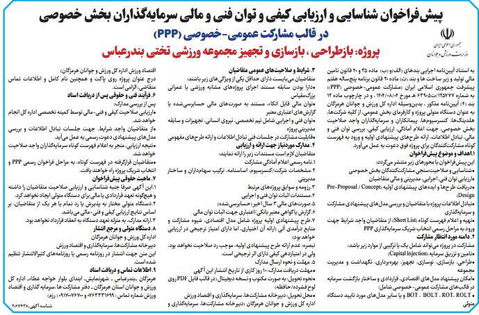 پیشفراخوان شناسایی و ارزیابی کیفی و توان فنی و مالی سرمایهگذاران بخش خصوصی در قالب مشارکت عمومی-خصوصی (PPP)پروژه: بازطراحی ، بازسازی و تجهیز مجموعه ورزشی تختی بندرعباس