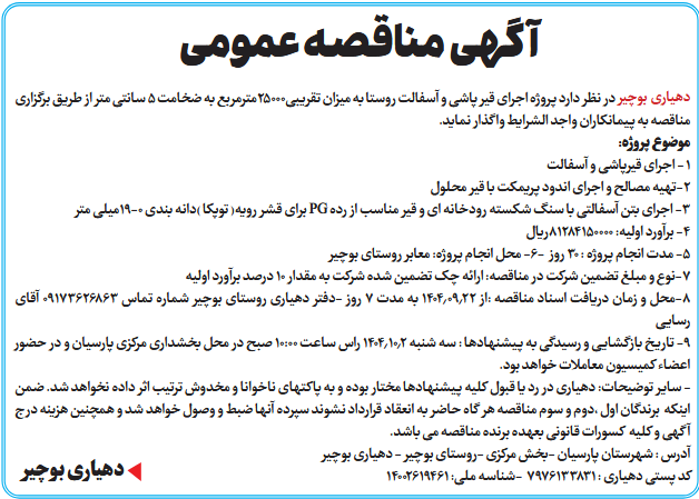 دهیاری بوچیر در نظر دارد پروژه اجرای قیر پاشی و آسفالت روستا به میزان تقریبی25000مترمربع به ضخامت 5 سانتی متر از طریق برگزاری مناقصه به پیمانکاران واجد الشرایط واگذار نماید.
