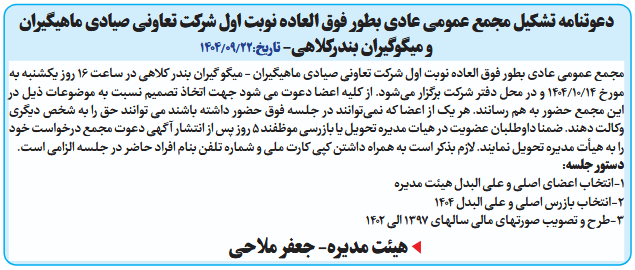 مجمع عمومی عادی بطور فوق العاده نوبت اول شرکت تعاونی صیادی ماهیگیران - میگو گیران بندر کلاهی در ساعت ۱۶ روز یکشنبه به مورخ 14/۱۰/1404 و در محل دفتر شرکت برگزار میشود. از کلیه اعضا دعوت می شود جهت اتخاذ تصمیم نسبت به موضوعات ذیل در این مجمع حضور به هم رسانند. هر یک از اعضا که نمیتوانند در جلسه فوق حضور داشته باشند می توانند حق را به شخص دیگری وکالت دهند. ضمنا داوطلبان عضویت در هیات مدیره تحویل یا بازرسی موظفند ۵ روز پس از انتشار آگهی دعوت مجمع درخواست خود را به هیأت مدیره تحویل نمایند. لازم بذکر است به همراه داشتن کپی کارت ملی و شماره تلفن بنام افراد حاضر در جلسه الزامی است.