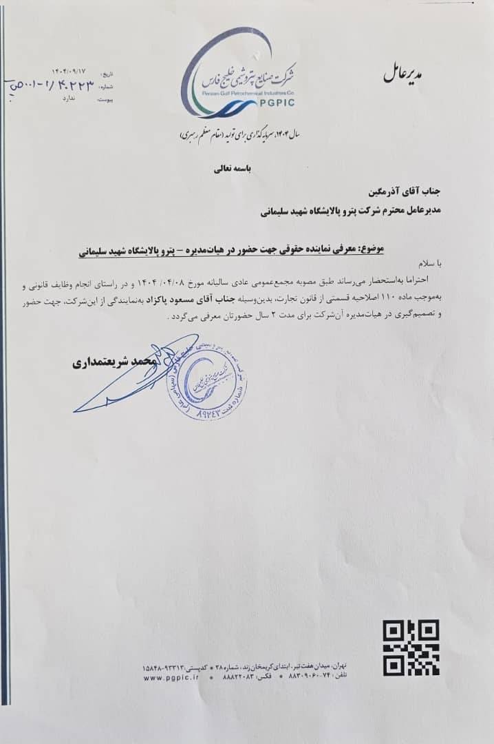 به گزارش صبح ساحلِ محمد شریعتمداری مدیرعامل هلدینگ خلیج فارس بعنوان بزرگترين هلدینگ پتروشیمی کشور و دومین شرکت شیمیایی در خاورمیانه طی مکاتبه ای مسعود پاک زاد را بعنوان نماینده حقوقی هلدینگ در نخستین پتروپالایشگاه ایران بمدت ۲سال معرفی کرد.