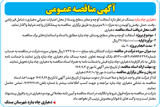 دهیاری چاه بنارد بستک در نظر دارد آسفالت کوچه و معابر سطح روستا( از محل اعتبارات عمرانی دهیاری)( شامل قیر پاشی ، پخت ،حمل ،پخش و کوبیدن) به متراژ000/9مترمربع به طریق برگزاری مناقصه به پیمانکاران واجد شرایط واگذار نماید.