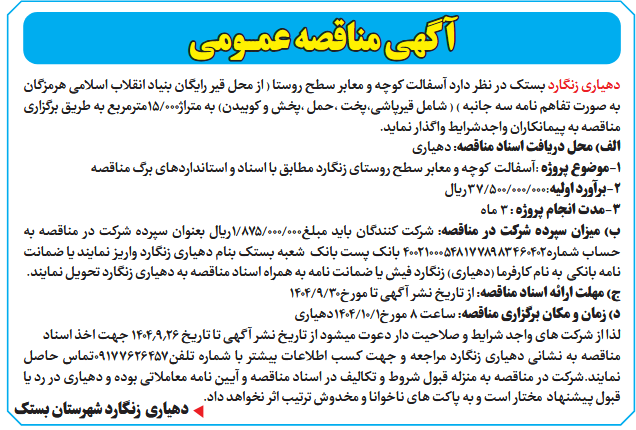 دهیاری زنگارد بستک در نظر دارد آسفالت کوچه و معابر سطح روستا ( از محل قیر رایگان بنیاد انقلاب اسلامی هرمزگان به صورت تفاهم نامه سه جانبه ) ( شامل قیرپاشی،پخت ،حمل ،پخش و کوبیدن) به متراژ000/15مترمربع به طریق برگزاری مناقصه به پیمانکاران واجدشرایط واگذار نماید.