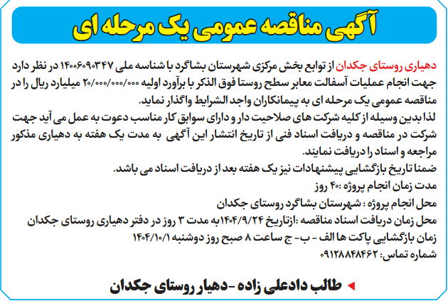 دهیاری روستای جکدان از توابع بخش مرکزی شهرستان بشاگرد با شناسه ملی 14006090347 در نظر دارد جهت انجام عملیات آسفالت معابر سطح روستا فوق الذکر با برآورد اولیه 000/000/000/20 میلیارد ریال را در مناقصه عمومی یک مرحله ای به پیمانکاران واجد الشرایط واگذار نماید.