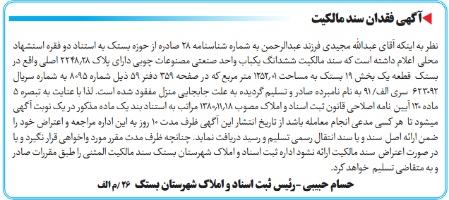 نظر به اینکه آقای عبدالله مجیدی فرزند عبدالرحمن به شماره شناسنامه ۲۸ صادره از حوزه بستک به استناد دو فقره استشهاد محلی اعلام داشته است که سند مالکیت ششدانگ یکباب واحد صنعتی مصنوعات چوبی دارای پلاک ۲۲۴۸٫۲۸ اصلی واقع در بستک قطعه یک بخش ۱۹ بستک به مساحت ۱۲۵۲٫۰۱ متر مربع که در صفحه ۳۵۹ دفتر ۵۹ ذیل شماره ۸۰۹۵ به شماره سریال ۶۲۳۰۹۲ سری الف/ ۹۱ به نام نامبرده صادر و تسلیم گردیده به علت جابجایی منزل مفقود شده است. لذا با عنایت به تبصره ۵ ماده ۱۲۰ آیین نامه اصلاحی قانون ثبت اسناد و املاک مصوب ۱۳۸۰٫۱۱٫۱۸ مراتب به استناد بند یک ماده مذکور در یک نوبت آگهی میشود تا هر کسی مدعی انجام معامله باشد از تاریخ انتشار این آگهی ظرف مدت ۱۰ روز به این اداره مراجعه و اعتراض خود را ضمن ارائه اصل سند و یا سند انتقال رسمی تسلیم و رسید دریافت نماید. چنانچه ظرف مدت مقرر مورد واخواهی قرار نگیرد و یا در صورت اعتراض سند مالکیت ارائه نشود اداره ثبت اسناد و املاک شهرستان بستک سند مالکیت المثنی را طبق مقررات صادر و به متقاضی تسلیم خواهد کرد.