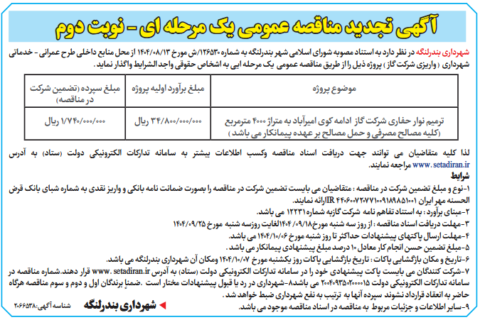 شهرداری بندرلنگه در نظر دارد به استناد مصوبه شورای اسلامی شهر بندرلنگه به شماره 126530/ش مورخ 13/08/1404 از محل منابع داخلی طرح عمرانی - خدماتی شهرداری ( واریزی شرکت گاز ) پروژه ذیل را از طریق مناقصه عمومی یک مرحله ایی به اشخاص حقوقی واجد الشرایط واگذار نماید .