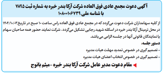 از کلیه سهامداران شرکت دعوت میگردد که در مجمع عادی فوق العاده راس ساعت ۱۰ صبح در تاریخ03/10/1404 در محل ترمینال آرکا بندر خبره در اسکله شهید رجایی تشکیل میگردد ، شرکت نمایند حضور همه صاحبان سهام یا نمایندگان قانونی آنها در جلسه الزامی میباشد.
