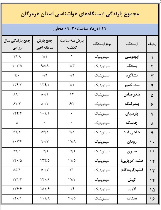 بر اساس گزارش ایستگاههای هواشناسی استان هرمزگان، مجموع بارندگی ثبتشده تا ساعت ۹:۳۰ صبح ۲۶ آذرماه نشان میدهد که سامانه بارشی اخیر، اغلب شهرهای استان را تحت تأثیر قرار داده و در برخی مناطق از جمله کیش، لاوان و بندرخمیر، بارشهای قابل توجهی به ثبت رسیده است.