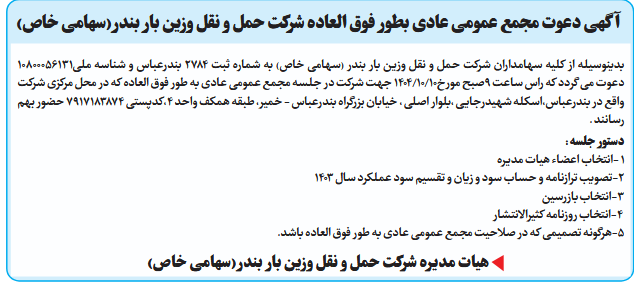 بدینوسیله از کلیه سهامداران شرکت حمل و نقل وزین بار بندر (سهامی خاص) به شماره ثبت 2784 بندرعباس و شناسه ملی10800056131 دعوت می گردد که راس ساعت 9صبح مورخ10/10/1404 جهت شرکت در جلسه مجمع عمومی عادی به طور فوق العاده که در محل مرکزی شرکت واقع در بندرعباس،اسکله شهیدرجایی ،بلوار اصلی ، خیابان بزرگراه بندرعباس - خمیر، طبقه همکف واحد 4،کدپستی 7917183874 حضور بهم رسانند .