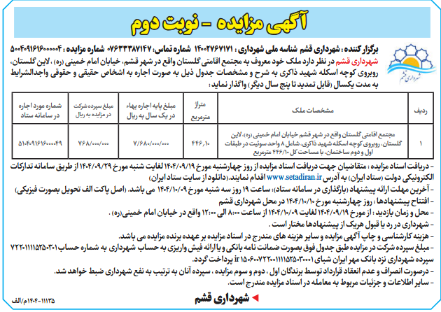 شهرداری قشم در نظر دارد ملک خود معروف به مجتمع اقامتی گلستان واقع در شهر قشم، خیابان امام خمینی (ره) ، لاین گلستان، روبروی کوچه اسکله شهید ذاکری به شرح و مشخصات جدول ذیل به صورت اجاره به اشخاص حقیقی و حقوقی واجدالشرایط