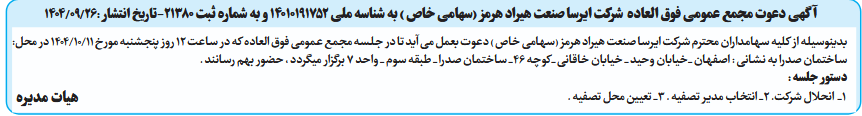 بدینوسیله از کلیه سهامداران محترم شرکت ایرسا صنعت هیراد هرمز (سهامی خاص ) دعوت بعمل می آید تا در جلسه مجمع عمومی فوق العاده که در ساعت 12 روز پنجشنبه مورخ 11/10/1404 در محل: ساختمان صدرا به نشانی : اصفهان خیابان وحید خیابان خاقانی کوچه 46 ساختمان صدرا طبقه سوم واحد 7 برگزار میگردد ، حضور بهم رسانند .