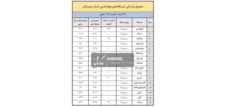 در مقابل، ابوموسی با ۲۱.۷ میلیمتر کمترین میزان بارش سامانه اخیر را به خود اختصاص داده و پس از آن، سیری با ۲۳.۵ میلیمتر در رده کمبارشترین مناطق استان قرار گرفته است.