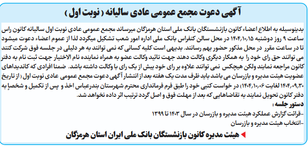 بدینوسیله به اطلاع اعضاء کانون بازنشستگان بانک ملی استان هرمزگان میرساند مجمع عمومی عادی نوبت اول سالیانه کانون راس ساعت 9 روز دوشنبه ۱4۰4٫۱۰٫۱۵ در محل سالن کنفراس بانک ملی اداره امور شعب تشکیل میگردد لذا از عموم اعضاء دعوت میشود تا در ساعت مقرر در محل مذکور حضور بهم رسانند. بدیهی است کلیه کسانی که نمی توانند به هر دلیلی در جلسه فوق شرکت کنند می توانند حق رای خود را به همکار دیگری وکالت دهند جهت تائید وکالت عضو به همراه نماینده نام الاختیار جهت ثبت نام به دفتر کانون مراجعه نمایند ولكن هیچکس نمی توانند علاوه بر رای خود بیش از یک رای با وکالت داشته باشد. ضمنا افرادی که کاندیداهای عضویت هیئت مدیره و بازرسان می باشد باید ظرف مدت یک هفته بعد از انتشار آگهی دعوت مجمع عمومی عادی نوبت اول ( از تاریخ ۱4۰4٫۰۹٫۳۰ لغایت ۱4۰4٫۱۰٫۰۶) در خواست کتبی خود را طبق فرم فرمانداری محترم شهرستان بندرعباس اخذ و پس از تکمیل و شخصاً به دفتر کانون تحویل نمایند به تقاضاهایی که بعد از مهلت فوق و اصل گردد ترتیب اثر داده نخواهد شد.