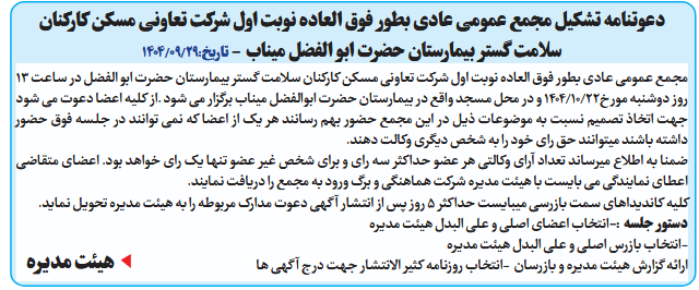 مجمع عمومی عادی بطور فوق العاده نوبت اول شرکت تعاونی مسکن کارکنان سلامت گستر بیمارستان حضرت ابو الفضل در ساعت ۱۳ روز دوشنبه مورخ22/10/1404 و در محل مسجد واقع در بیمارستان حضرت ابوالفضل میناب برگزار می شود .از کلیه اعضا دعوت می شود جهت اتخاذ تصمیم نسبت به موضوعات ذیل در این مجمع حضور بهم رسانند هر یک از اعضا که نمی توانند در جلسه فوق حضور داشته باشند میتوانند حق رای خود را به شخص دیگری وکالت دهند.