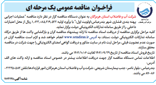 شركت آب و فاضلاب استان هرمزگان به عنوان دستگاه مناقصه گزار در نظر دارد مناقصه "عملیات اجرایی پهنه بندی فشاری شهر بندرعباس(اولویت اول)" با برآورد اولیه 1.043.085.219.522 ریال از محل اعتبارات داخلی، را از طریق سامانه تداركات الكترونیكی دولت برگزار نماید.