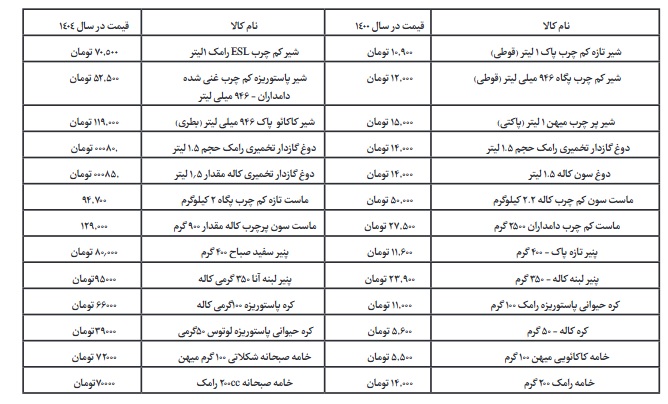 مقایسه قیمتها در بازار محصولات لبنی نشان میدهد روند افزایش قیمت این اقلام طی چهار سال به شکل ناموزون و سرسامآوری صورت گرفته است. بهطوریکه قیمت کره 50 گرمی از 5 هزار و 600 تومان به 39 هزار تومان رسیده است و یا در میان اقلام پرمصرف، شیر کمچرب یک لیتری قوطی از 10 هزار و 900 تومان به بیش از 70 هزار تومان رسیده است. در گروه پنیرها، پنیر ساده از 11 هزار و 600 تومان در سال 1400 به 80 هزار تومان در آبان 1404 رسیده است و تحقیقات میدانی نشان میدهد در حال حاضر 96 هزار تومان قیمت دارد.