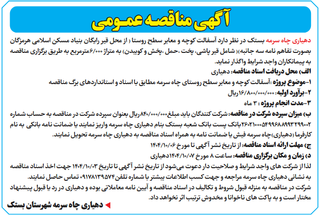 لذا از شرکت های واجد شرایط و صلاحیت دار دعوت میشود از تاریخ نشر آگهی تا تاریخ 03/10/1404 جهت اخذ اسناد مناقصه به نشانی دهیاری چاه سرمه مراجعه و جهت کسب اطلاعات بیشتر با شماره تلفن09178139574 تماس حاصل نمایند.