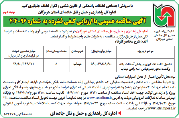 ج) شرایط متقاضی : 1 - داشتن شخصیت حقوقی 2- داشتن توانایی ارائه ضمانت نامه بانکی شرکت در فرآيند ارجاع كار و ضمانت نامه انجام تعهدات 3- دارا بودن رتبه 5 رشته راه و ترابری . لذا متقاضیانی که دارای شرایط مذکور در بند « ج » فوق بوده و آمادگی اجرای پروژه را دارند می توانند جهت اخذ اسناد مناقصه از ساعت 13:30 مورخ 01/10/1404 لغایت ساعت .13:00 مورخ07/10/1404 به پایگاه اینترنتی سامانه تدارکات الترونیکی دولت به آدرس www.setadiran.ir مراجعه نمایند، آخرین مهلت تحویل اسناد مناقصه، ساعت 13:00