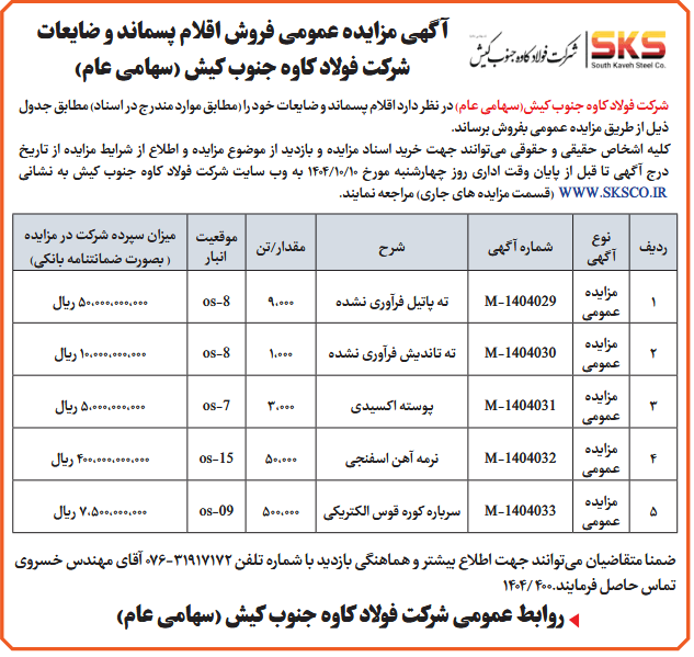 شركت فولاد کاوه جنوب کیش(سهامی عام) در نظر دارد اقلام پسماند و ضایعات خود را (مطابق موارد مندرج در اسناد) مطابق جدول ذیل از طريق مزايده عمومى بفروش برساند.