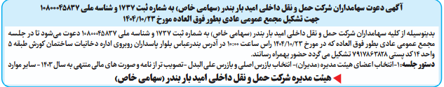 بدینوسیله از کلیه سهامداران شرکت حمل و نقل داخلی امید بار بندر (سهامی خاص) به شماره ثبت ۱۷۳۷ و شناسه ملی ۱۰۸۰۰۰45٨٣٧ دعوت میشود تا در جلسه مجمع عمومی عادی بطور فوق العاده که در مورخ 23/۱۰/1404 راس ساعت 10:00 در آدرس بندرعباس بلوار پاسداران روبروی اداره دخانیات ساختمان کورش طبقه ۵ واحد ۱۴ کد پستی ۷۹۱۷۸۶۳۸۲۸ تشکیل می گردد حضور بهمراه رسانند.