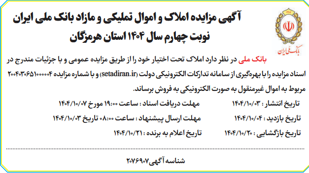 آگهی مزایده املاک و اموال تملیکی و مازاد نوبت چهارم سال 1404 استان هرمزگان