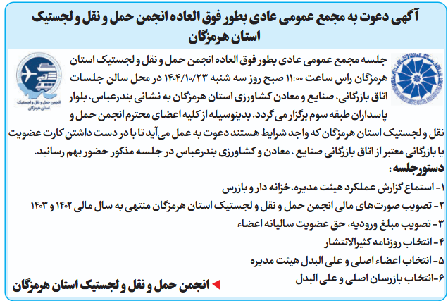 جلسه مجمع عمومی عادی بطور فوق العاده انجمن حمل و نقل و لجستیک استان هرمزگان راس ساعت 11:00 صبح روز سه شنبه 23/10/1404 در محل سالن جلسات اتاق بازرگانی، صنایع و معادن کشاورزی استان هرمزگان به نشانی بندرعباس، بلوار پاسداران طبقه سوم برگزار می گردد. بدینوسیله از کلیه اعضای محترم انجمن حمل و نقل و لجستیک استان هرمزگان که واجد شرایط هستند دعوت به عمل میآید تا با در دست داشتن کارت عضویت یا بازرگانی معتبر از اتاق بازرگانی صنایع ، معادن و کشاورزی بندرعباس در جلسه مذکور حضور بهم رسانید.