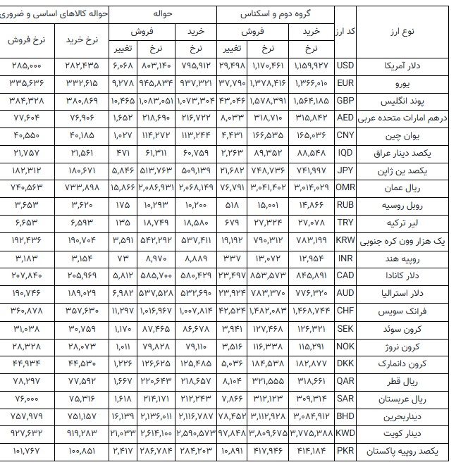 نرخ سایر ارزها و تغییرات آن بر حسب ریال به تفصیل در جدول زیر آمده است.