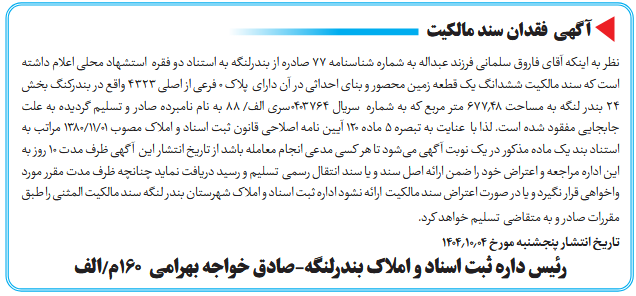 نظر به اینکه آقای فاروق سلمانی فرزند عبداله به شماره شناسنامه ۷۷ صادره از بندرلنگه به استناد دو فقره استشهاد محلی اعلام داشته است که سند مالکیت ششدانگ یک قطعه زمین محصور و بنای احداثی در آن دارای پلاک 0 فرعی از اصلی ۴۳۲۳ واقع در بندرکنگ بخش ۲۴ بندر لنگه به مساحت ۶۷۷٫۴۸ متر مربع که به شماره سریال 0403764سری الف/ ۸۸ به نام نامبرده صادر و تسلیم گردیده به علت جابجایی مفقود شده است. لذا با عنایت به تبصره ۵ ماده ۱۲۰ آیین نامه اصلاحی قانون ثبت اسناد و املاک مصوب 01/11/1380 مراتب به استناد بند یک ماده مذکور در یک نوبت آگهی میشود تا هر کسی مدعی انجام معامله باشد از تاریخ انتشار این آگهی ظرف مدت ۱۰ روز به این اداره مراجعه و اعتراض خود را ضمن ارائه اصل سند و یا سند انتقال رسمی تسلیم و رسید دریافت نماید چنانچه ظرف مدت مقرر مورد واخواهی قرار نگیرد و یا در صورت اعتراض سند مالکیت ارائه نشود اداره ثبت اسناد و املاک شهرستان بندر لنگه سند مالکیت المثنی را طبق مقررات صادر و به متقاضی تسلیم خواهد کرد.