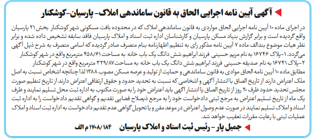 در اجرای ماده ۱۰ آیین نامه اجرایی الحاق مواردی به قانون ساماندهی املاک که در محدوده بافت مسکونی شهر کوشکنار بخش ۲۱ پارسیان واقع گردیده است و برابر گزارش بنیاد مسکن پارسیان و کارشناسان اداره ثبت اسناد و املاک پارسیان فاقد سابقه تشخیص داده شده و برابر نظر هیات موضوع بندالف ماده ۷ آیین نامه مذکور رای به تنظیم اظهارنامه بنام متصرف صادر گردیده که اسامی متصرف به شرح ذیل آگهی میگردد. 1-پلاک 16746 به نام مریم حسینی فرزند ابراهیم شش دانگ یک باب خانه به مساحت 61/458 مترمربع واقع در شهر کوشکنار