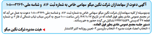 بدینوسیله از کلیه سهامداران شرکت نگین میگو سهامی خاص به شماره ثبت 816 و شناسه ملی 10800032640 دعوت به عمل می آید که در مجمع عمومی عادی بطور فوق العاده که در تاریخ 17/10/1404 راس ساعت 10:00 صبح به آدرس میناب تیاب شمالی ك فاز 2 پ شماره قطعه 37 کدپستی 7997115529 تشکیل می گردد حضور به هم رسانند .