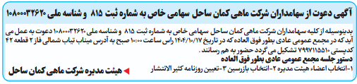 بدینوسیله از کلیه سهامداران شرکت ماهی کمان ساحل سهامی خاص به شماره ثبت 815 و شناسه ملی 10800032620 دعوت به عمل می آید که در مجمع عمومی عادی بطور فوق العاده که در تاریخ 17/10/1404 راس ساعت 10:00 صبح به آدرس میناب تیاب شمالی فاز 2 قطعه 42 کدپستی 7997115510 تشکیل می گردد حضور به هم رسانند .