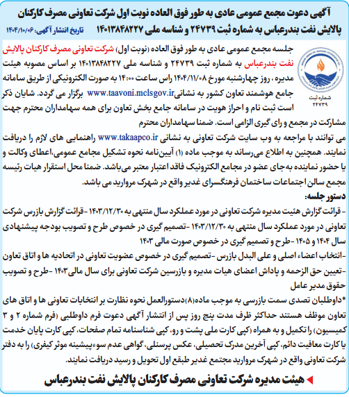 جلسه مجمع عمومی عادی به طور فوق العاده (نوبت اول) شرکت تعاونی مصرف کارکنان پالایش نفت بندرعباس به شماره ثبت 24739 و شناسه ملی 14013848227 بر اساس مصوبه هیئت مدیره ، روز چهارشنبه مورخ 08/11/1404 راس ساعت 14:00 به صورت الکترونیکی از طریق سامانه جامع هوشمند تعاون کشور به نشانیwww.taavoni.mclsgov.ir برگزار می گردد. شایان ذکر است ثبت نام و احراز هویت در سامانه جامع بخش تعاون برای همه سهامداران محترم جهت مشارکت در مجمع و رای گیری الزامی است. ضمنا سهامداران محترم