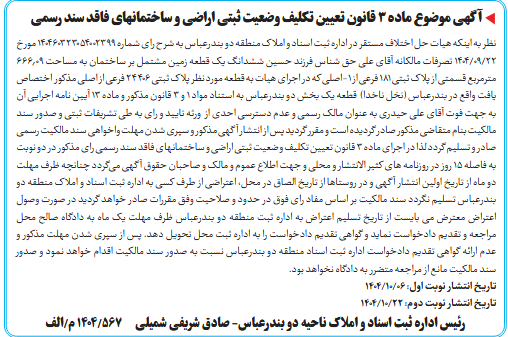 نظر به اینکه هیات حل اختلاف مستقر در اداره ثبت اسناد و املاک منطقه دو بندرعباس به شرح رای شماره 140460323054002399 مورخ 22/09/1404 تصرفات مالکانه آقای علی حق شناس فرزند حسین ششدانگ یک قطعه زمین مشتمل بر ساختمان به مساحت 666.09 مترمربع قسمتی از پلاک ثبتی 181 فرعی از 1-اصلی که در اجرای هیات به قطعه مورد نظر پلاک ثبتی 24406 فرعی از اصلی مذکور اختصاص یافت واقع در بندرعباس (نخل ناخدا) قطعه یک بخش دو بندرعباس به استناد مواد ۱ و ۳ قانون مذکور و ماده ۱۳ آیین نامه اجرایی آن به جهت فوت آقای علی حیدری به عنوان مالک رسمی و عدم دسترسی احدی از ورثه تایید و رای به طی تشریفات ثبتی و صدور سند مالکیت بنام متقاضی مذکور صادر گردیده است و مقرر گردید پس از انتشار آگهی مذکور و سپری شدن مهلت واخواهی سند مالکیت رسمی صادر و تسلیم گردد لذا در اجرای ماده ۳ قانون تعیین تکلیف وضعیت ثبتی اراضی و ساختمانهای فاقد سند رسمی رای مذکور در دو نوبت