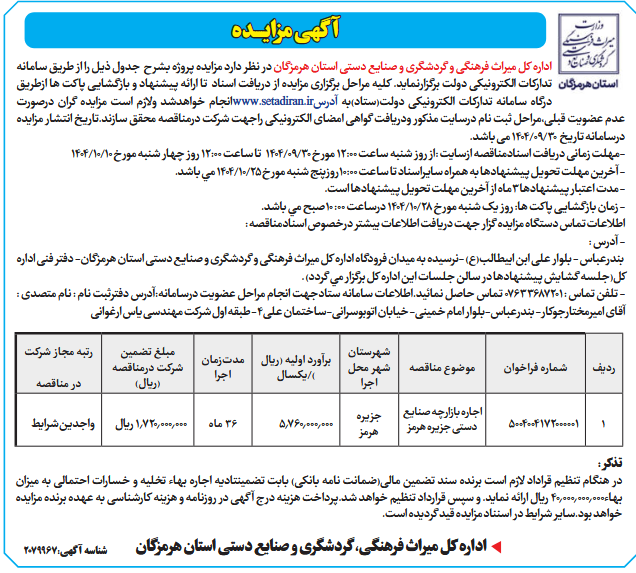 داره كل میراث فرهنگی و گردشگری و صنایع دستی استان هرمزگان در نظر دارد مزایده پروژه بشرح جدول ذيل را از طريق سامانه تدارکات الکترونیکی دولت برگزارنماید. کلیه مراحل برگزاری مزایده از دریافت اسناد تا ارائه پیشنهاد و بازگشایی پاکت ها ازطریق درگاه سامانه تدارکات الکترونیکی دولت(ستاد)به آدرسwww.setadiran.irانجام خواهدشد ولازم است مزایده گران درصورت عدم عضویت قبلی،مراحل ثبت نام درسایت مذکور ودریافت گواهی امضای الکترونیکی راجهت شرکت درمناقصه محقق سازند.تاریخ انتشار مزایده درسامانه تاریخ 30/09/1404 می باشد.