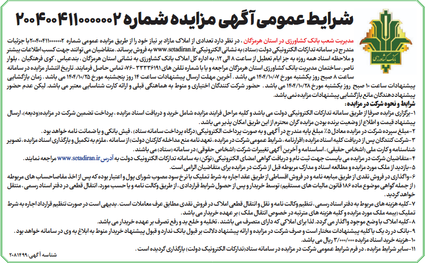 مدیریت شعب بانک کشاورزی در استان هرمزگان ، در نظر دارد تعدادی از املاک مازاد بر نیاز خود را از طریق مزایده عمومی شماره 2004004110000002با جزئیات مندرج در سامانه تدارکات الکترونیکی دولت (ستاد) به نشانی الکترونیکی www.setadiran.ir به فروش برساند . متقاضیان می توانند جهت کسب اطلاعات بیشتر و ملاحظه اسناد همه روزه به جز ایام تعطیل از ساعت 8 الی 12، به اداره کل املاک بانک کشاورزی به نشانی استان هرمزگان ، بندعباس ، کوی فرهنگیان ، بلوار ناصر، ساختمان مدیریت بانک کشاورزی استان هرمزگان مراجعه و یا با شماره تلفن های 33336191 -076 تماس حاصل فرمایند. تاریخ انتشار مزایده در سامانه ساعت 8 صبح روز یکشنبه مورخ 07/10/1404 می باشد . آخرین مهلت ارسال پیشنهادات ساعت 14 روز پنجشنبه مورخ 25/10/1404 می باشد . زمان بازگشایی پیشنهادات ساعت 10 صبح روز یکشنبه مورخ 28/10/1404 می باشد . حضور شرکت کنندگان اختیاری و منوط به هماهنگی قبلی و ارائه کارت شناسایی معتبر می باشد. لیکن عدم حضور پیشنهاد دهندگان مانع بازگشایی پیشنهادات مزایده نمی باشد.