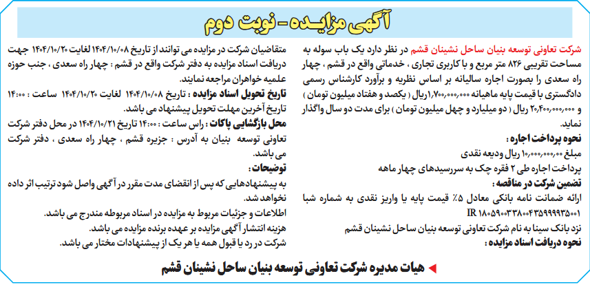 شرکت تعاونی توسعه بنیان ساحل نشینان قشم در نظر دارد یک باب سوله به مساحت تقریبی 826 متر مربع و با کاربری تجاری ، خدماتی واقع در قشم ، چهار راه سعدی را بصورت اجاره سالیانه بر اساس نظریه و برآورد کارشناس رسمی دادگستری با قیمت پایه ماهیانه 1.700.000.000ریال ( یکصد و هفتاد میلیون تومان ) و 20.400.000.000 ریال ( دو میلیارد و چهل میلیون تومان ) برای مدت دو سال واگذار نماید.
