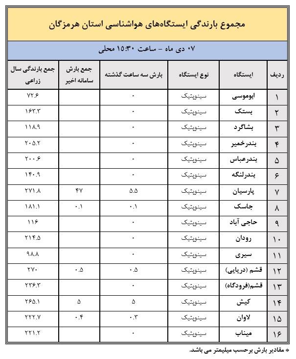 به گزارش صبح ساحل بر اساس جدول منتشرشده از مجموع بارندگی ایستگاههای هواشناسی استان هرمزگان تا ساعت ۱۵:۳۰ روز هفتم دیماه، ایستگاه پارسیان با ثبت ۲۷۱.۸ میلیمتر بارندگی، بیشترین میزان بارش تجمعی سال زراعی را به خود اختصاص داده است. پس از آن، ایستگاههای بندرخمیر با ۲۰۵.۲ میلیمتر، رودان با ۲۱۴.۵ میلیمتر و قشم فرودگاه با ۲۶۶.۲ میلیمتر در ردههای بعدی قرار دارند.