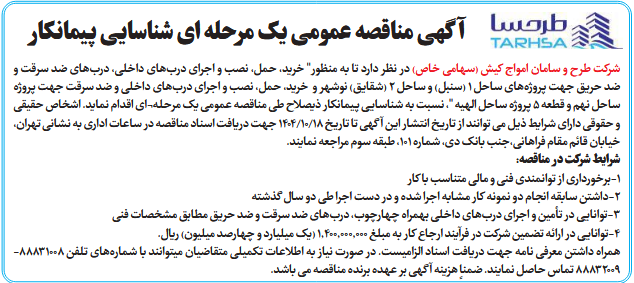 شرکت طرح و سامان امواج کیش (سهامی خاص) در نظر دارد تا به منظور" خرید، حمل، نصب و اجرای دربهای داخلی، دربهای ضد سرقت و ضد حریق جهت پروژههای ساحل 1 (سنبل) و ساحل 2 (شقایق) نوشهر و خرید، حمل، نصب و اجرای دربهای داخلی و ضد سرقت جهت پروژه ساحل نهم و قطعه 5 پروژه ساحل الهیه "، نسبت به شناسایی پیمانکار ذیصلاح طی مناقصه عمومی یک مرحله¬ای اقدام نماید. اشخاص حقیقی و حقوقی دارای شرایط ذیل می توانند از تاریخ انتشار این آگهی تا تاریخ 18/10/1404 جهت دریافت اسناد مناقصه در ساعات اداری به نشانی تهران، خیابان قائم مقام فراهانی،جنب بانک دی، شماره 101، طبقه سوم مراجعه نمایند.