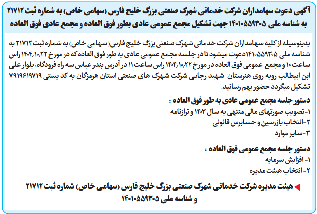 بدینوسیله از کلیه سهامداران شرکت خدماتی شهرک صنعتی بزرگ خلیج فارس( سهامی خاص) به شماره ثبت ۲۱۷۱۲ به شناسه ملی 1410559305دعوت میشود تا در جلسه مجمع عمومی عادی به طور فوق العاده که در مورخ ۱۴۰۴٫۱۰٫۲۲ راس ساعت ۱۰ و مجمع عمومی فوق العاده در مورخ ۱۴۰۴٫۱۰٫۲۲ راس ساعت ۱۱ در آدرس بندر عباس سه راه فرودگاه، بلوار علی ابن ابیطالب روبه روی هنرستان شهید رجایی شرکت شهرک های صنعتی استان هرمزگان به کد پستی ۷۹۱۹۶۱۹۷۱۹ تشکیل میگردد حضور بهم رسانید.